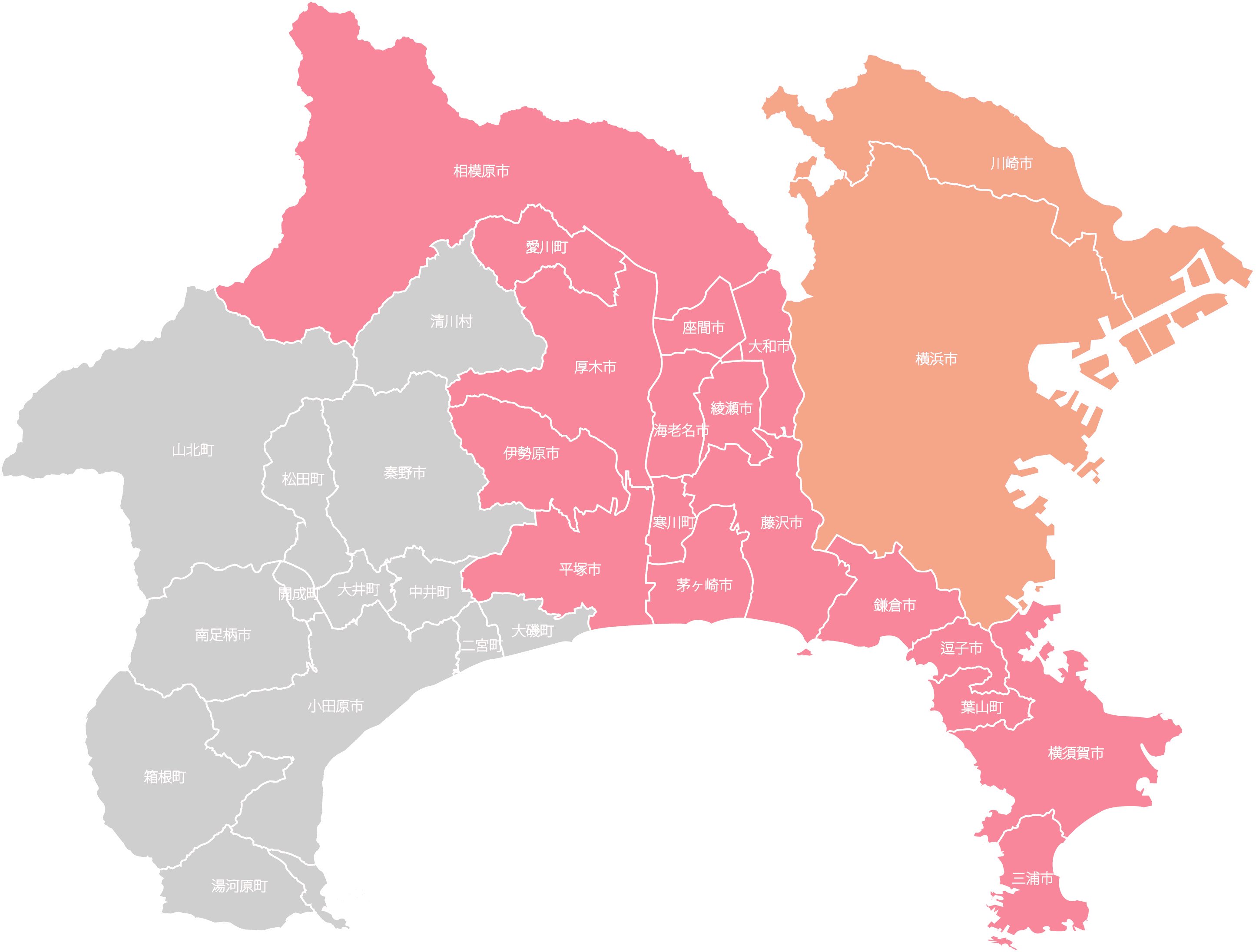鎌倉市/逗子市/葉山町/横須賀市/藤沢市/茅ヶ崎市/平塚市/寒川町/伊勢原市/海老名市/綾瀬市/厚木市/ 大和市/座間市/相模原市/愛川町